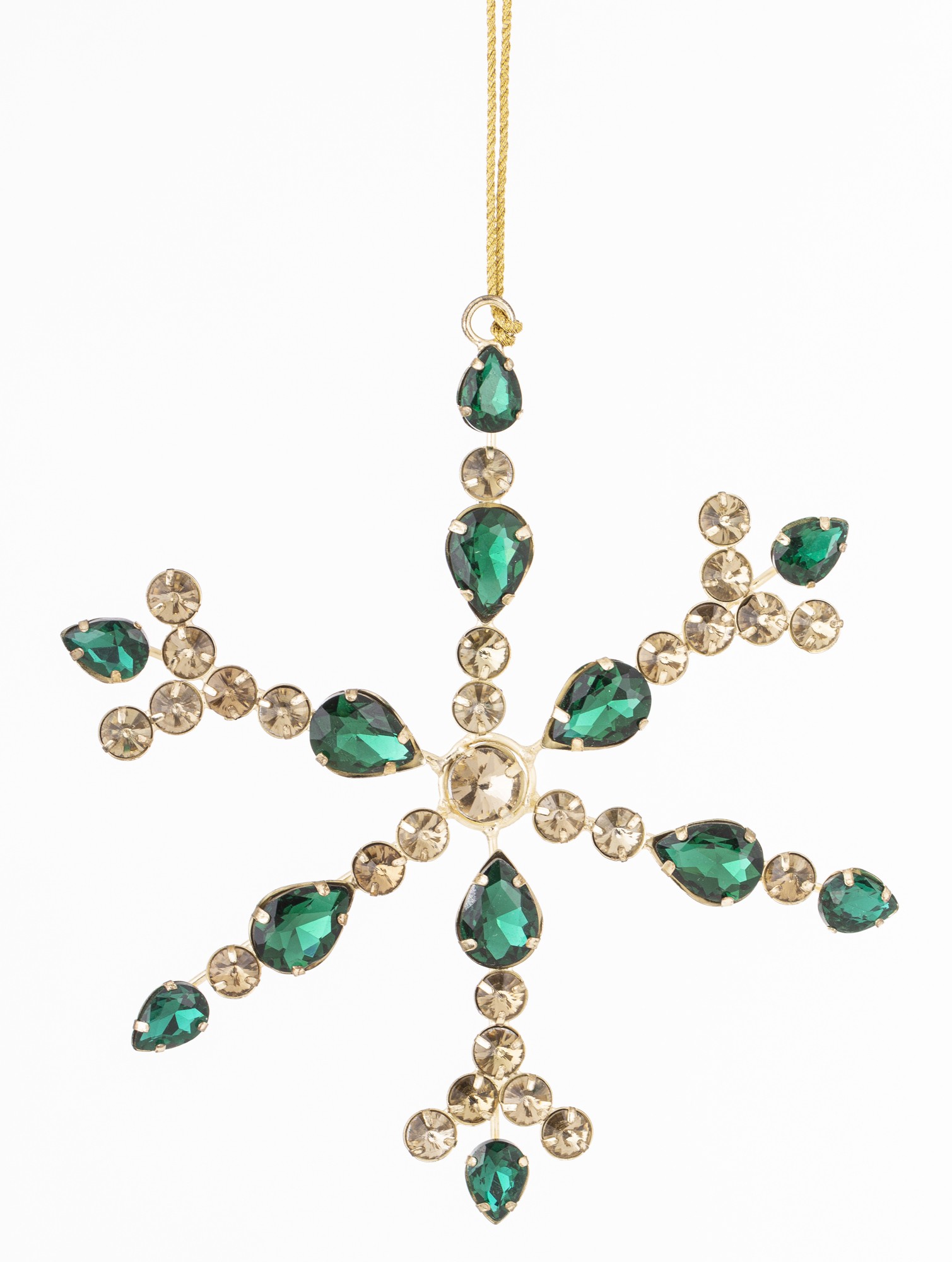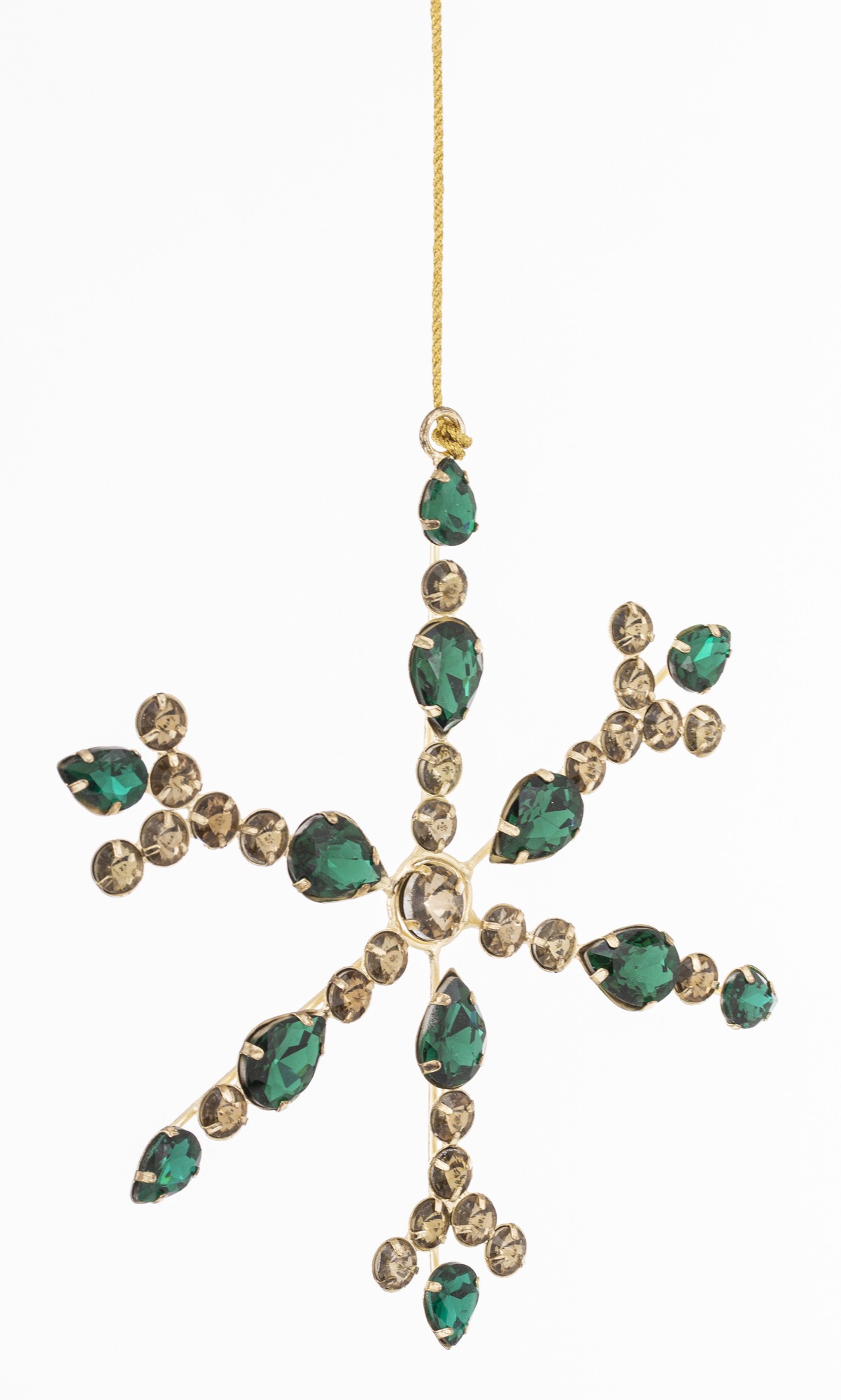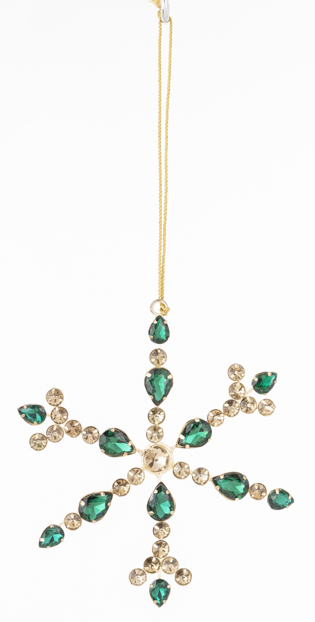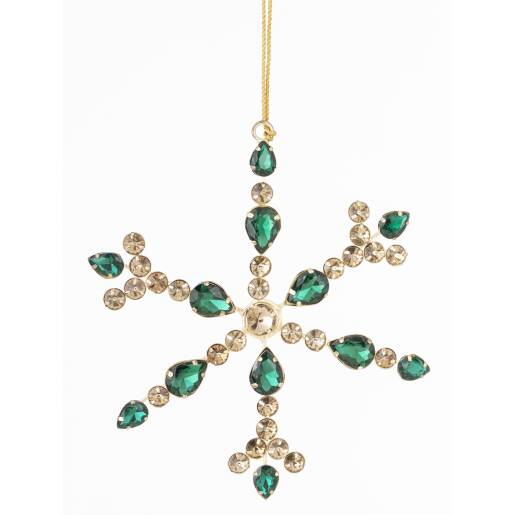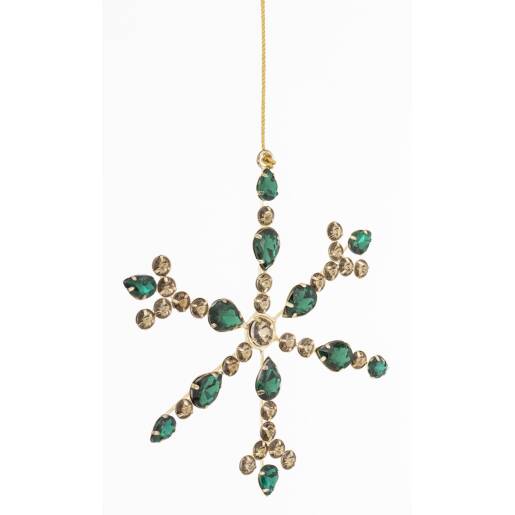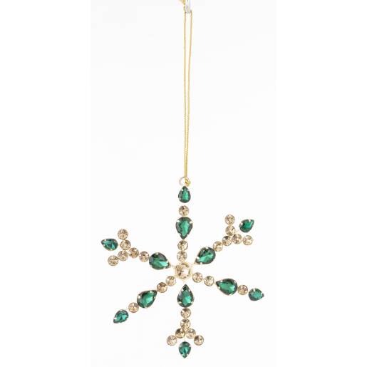 Pridajte do svojho domova luxusný a žiarivý nádych s našou nádhernou krištáľovou vločkou na stromček. Táto elegantná dekorácia, s kovovým rámom a sklenenými krištáľmi v zelených a zlatých odtieňoch, dodá vášmu vianočnému stromčeku oslňujúci lesk a eleganciu.