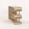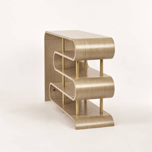 Béžová konzola so zlatými nohami z kolekcie Stilig fascinuje svojím jedinečným tvarom, ktorý pripomína plynulý pohyb vlny. Poličky vytvárajú originálny sínusový rytmus, čím pôsobia ako dizajnový objekt aj praktický úložný priestor v jednom. Vďaka dyhovanému povrchu s viditeľnou štruktúrou dreva a zlatým akcentom pôsobí nábytok elegantne a moderne zároveň.