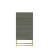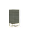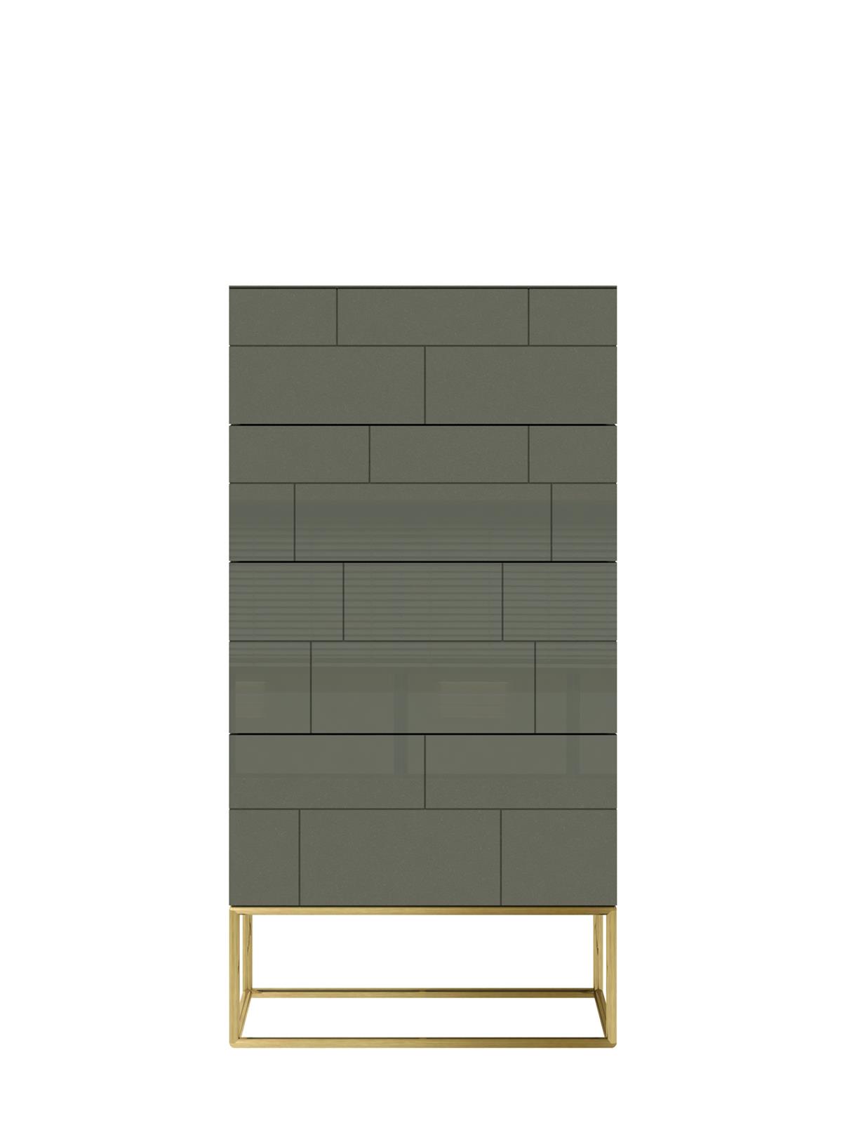 Moderná klasická komoda v cemente Green s kontrastnými zlatými nohami vyrobenými z nehrdzavejúcej ocele. Telo MDF je vyrobené z vysokého lesku. Charakteristické 3D fronty.