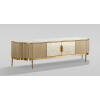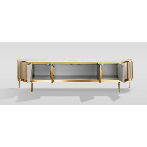 Stolík má štyri dvierka s kovovými úchytkami a systémom soft-close pre komfortné a tiché zatváranie. Vnútro je svetlosivé a ponúka praktický úložný priestor na multimediálne zariadenia aj doplnky. TV stolík Stilig zlatý je ideálny pre milovníkov glamour interiérov, kde každý detail hrá dôležitú rolu.