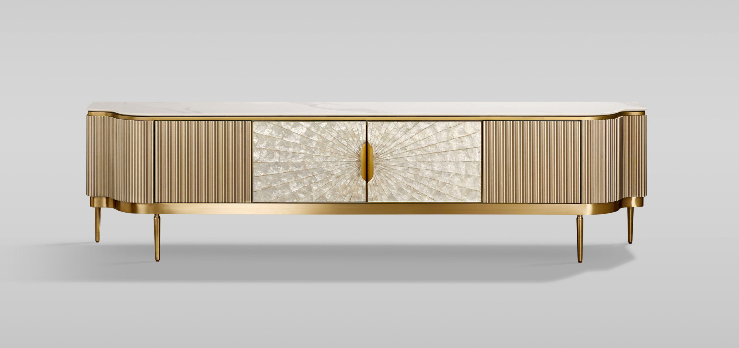 TV Stolík Stilig Zlatý – Luxusný TV Nábytok S Morskou Mušľou A Mramorovou Doskou
