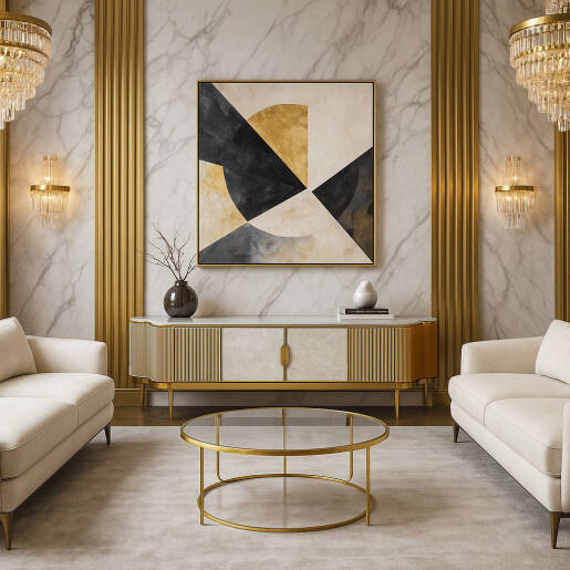 Centrálna časť stolíka je tvorená dvomi dvierkami s dekorom z morskej mušle, usporiadaným do sofistikovaného slnečného vzoru. Bočné časti korpusu zdobí ryhovaný povrch, ktorý dodáva nábytku textúru a hĺbku. Kombinácia šampaňského zlata, bieleho syntetického mramoru a jemného krémového odtieňa frontov pôsobí elegantne a nadčasovo.
